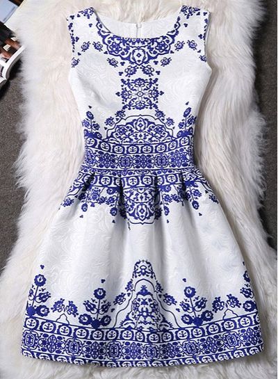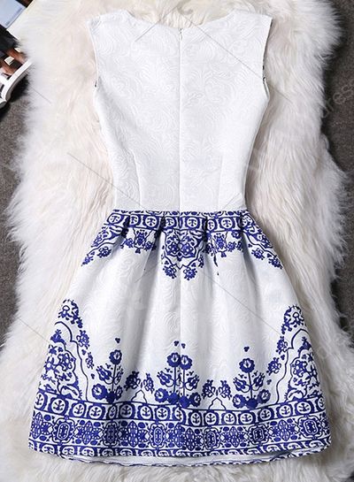 优雅圆领无袖印花提花连衣裙